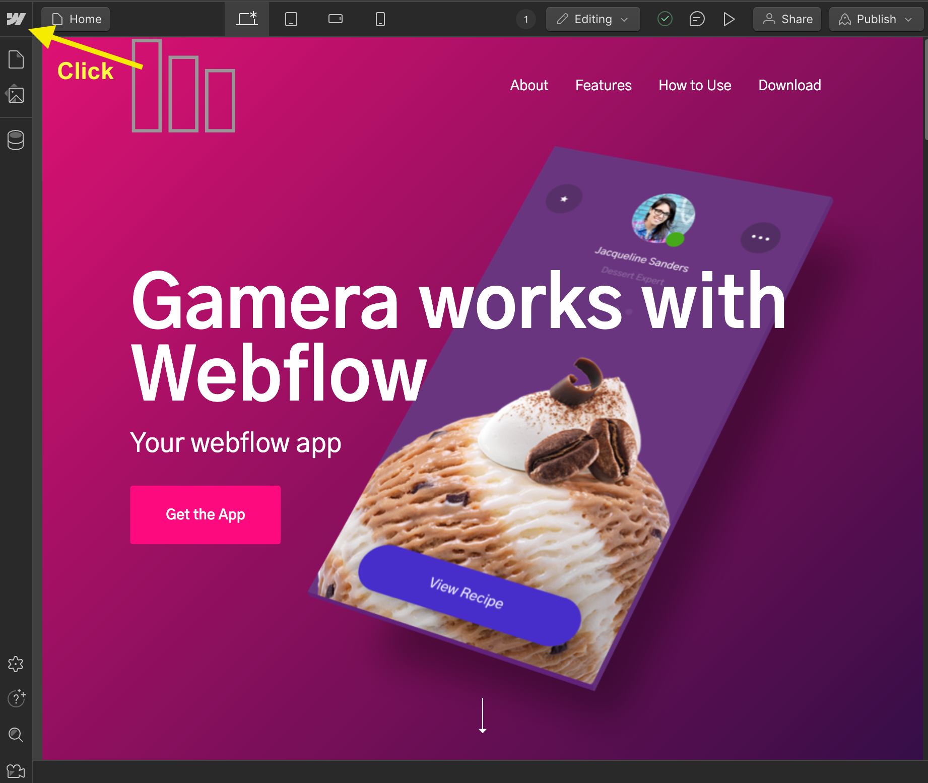 Adding Gamera to your Webflow site is extremely simple and can be done directly from within the logged-in Webflow site designer. Simply follow the instructions below: